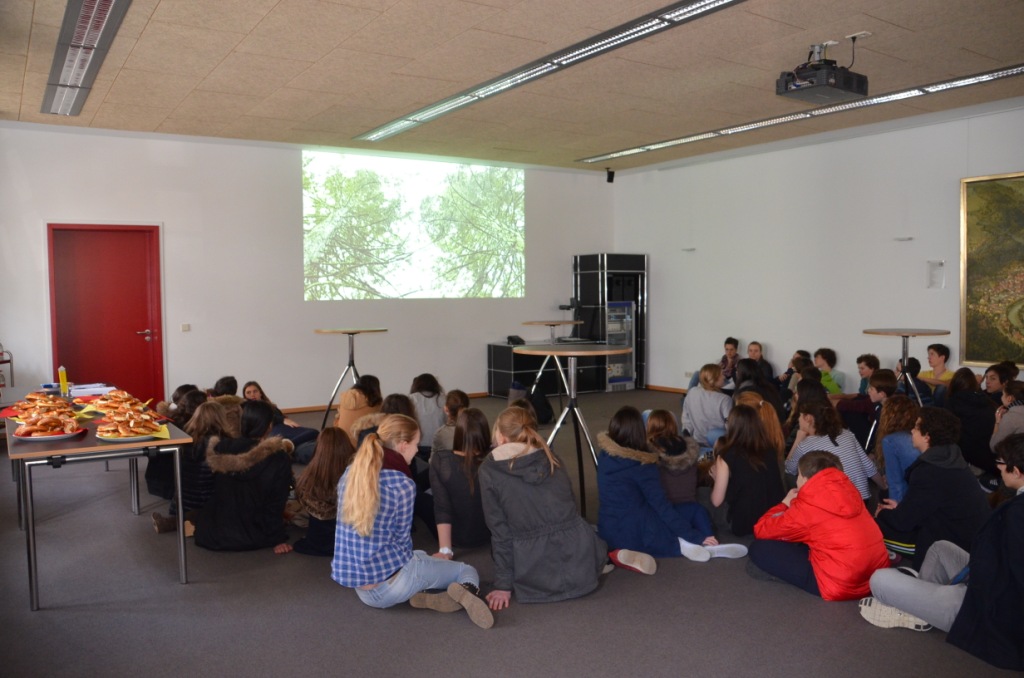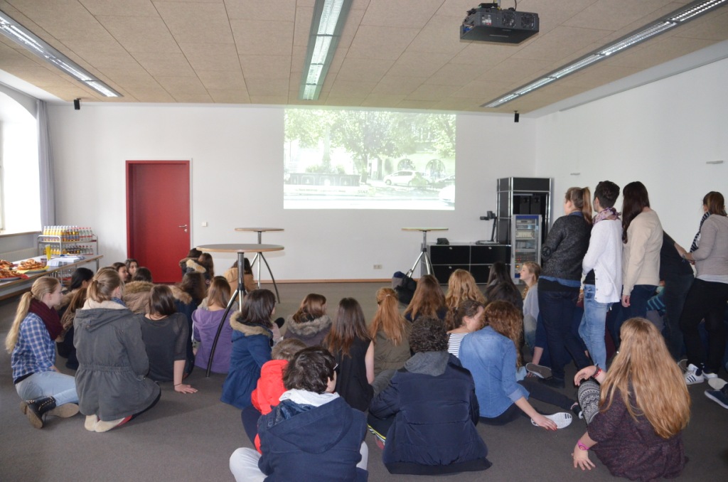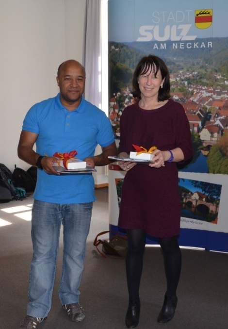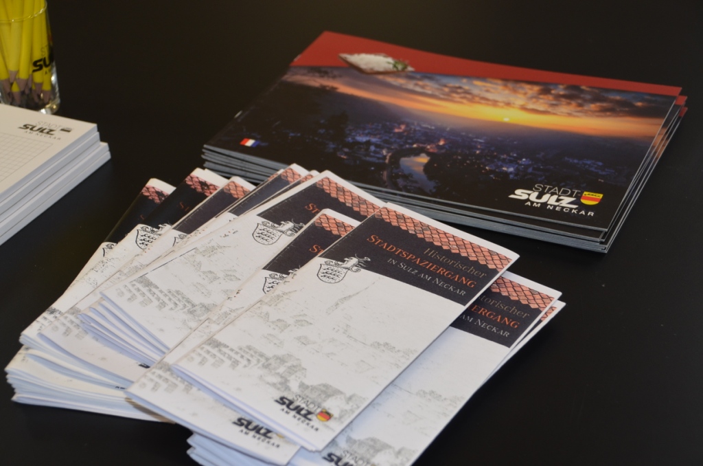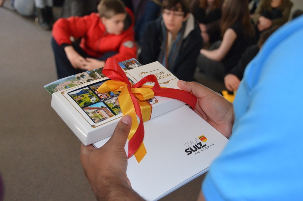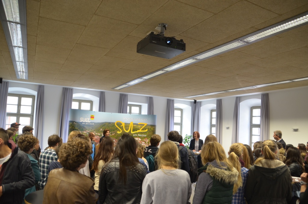 Eine Frau hat uns im Rathaus von Sulz empfangen und hat uns einen Film über einige Dörfer, wie zum Beispiel Bergfelden und Renfrizhausen, gezeigt. Wir konnten die verschiedenen Landschaften und Sehenswürdigkeiten sehen. Dann haben wir ein Quiz über die verschiedenen Dörfer gemacht. Danach haben wir Brezeln gegessen und typische Getränke getrunken. Zum Abschied haben wir für die Zeitungen Gruppenfotos gemacht.
