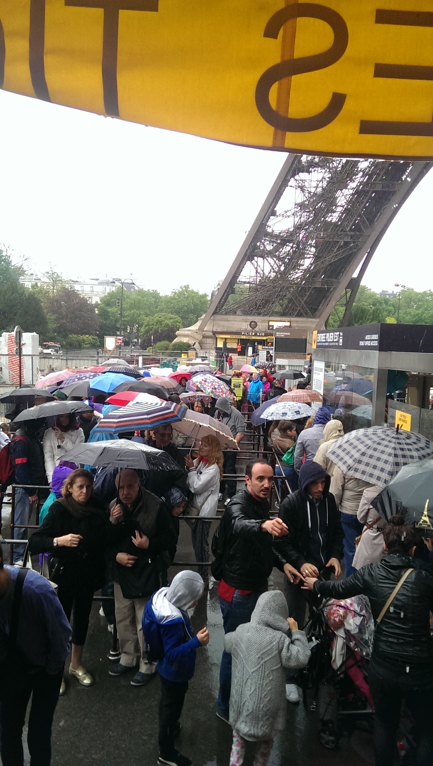 Nachdem wir auschgeschlafen und ausgiebig gefruestueckt haben, sind wir mit der Métro bis zur Station „Champ de Mars Tour Eiffel“ gefahren. Als wir dann schließlich am Eiffelturm angekommen sind, mussten wir ungefaehr eine dreiviertel Stunde anstehen, da durch den franzoesischen Nationalfeiertag sehr viele Leute den Eiffelturm besichtigen wollten. Mit dem Aufzug sind wir dann bis zur zweiten Etage des Turms gefahren. Als wir dort ankahmen hatten wir sofort, trotz des schlechten Wetters, eine wunderbare Aussicht.