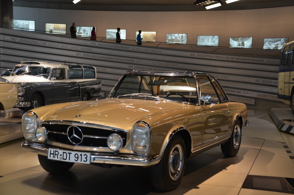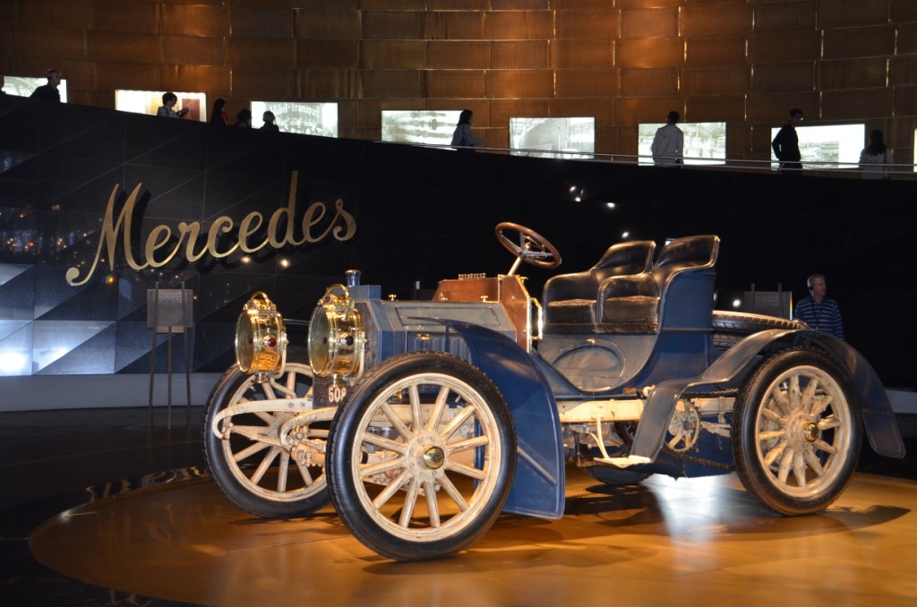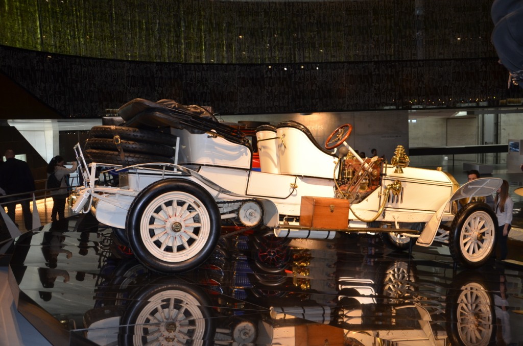 Nous sommes arrivés au musée Mercedes-Benz à 9h45. Nous étions en visite libre, sans guide, nous avons donc pu découvrir les lieux à notre guise, nous avons également reçu des guides audio. La visite s’organisait autour d’une frise chronologique, il y était décrit tous les événements marquants du XXe siècle et l’implication de Mercedes dans ces événements comme par exemple dans la Seconde Guerre Mondiale. Autour de cette frise il y avait toujours deux espaces dédiés uniquement aux voitures Mercedes, évidemment plus la frise allait loin dans le temps, plus les voitures étaient récentes. Puis nous avons quitté le musée à 13h pour aller à Stuttgart.